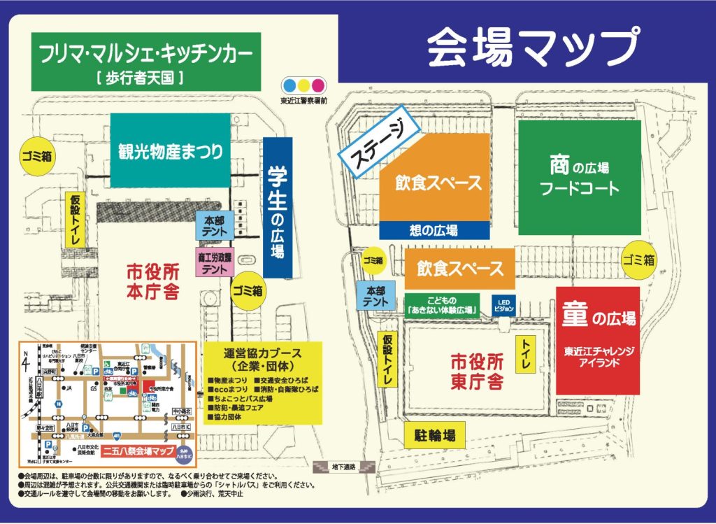 ・駐車場の台数には限りがございます。できる限り、公共交通機関(ちょこっとバス、路線バス)や自転車で御来場ください。